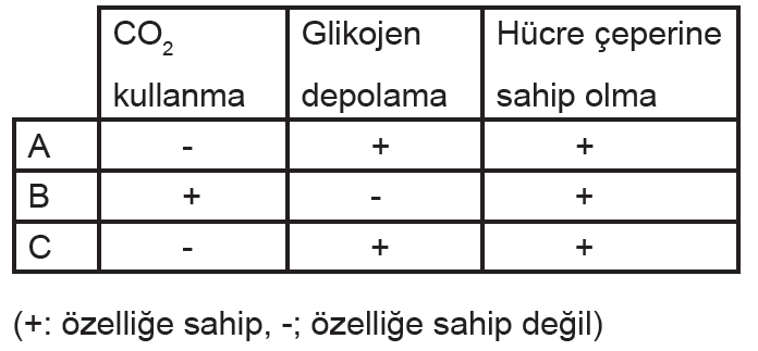 Tablodaki bilgilere göre A, B, C canlıları hakkında aşağıda verilen özelliklerden hangisi kesinlikle yanlıştır?