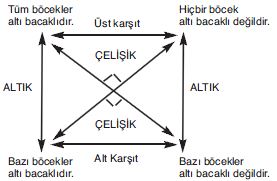Herhangi dört önermenin birbiriyle, yukarıdaki karşı olma karesinde gösterilen biçimde ilişkili olmaları için aşağıdakilerden hangisine sahip olmaları gerekir?